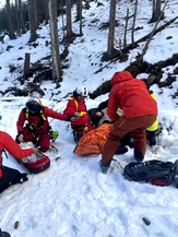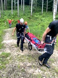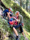 Im Zuge des Abtransports verletzte sich ein Bergretter (Übungseinlage) der ebenfalls mit der Trage abtransportiert werden musste.