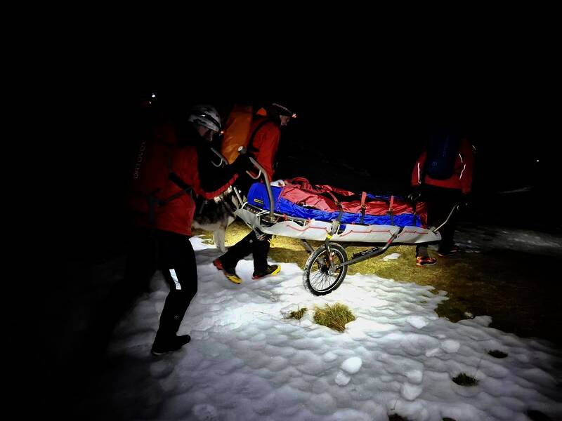 Im Zuge des Abtransports verletzte sich ein Bergretter (Übungseinlage) der ebenfalls mit der Trage abtransportiert werden musste.