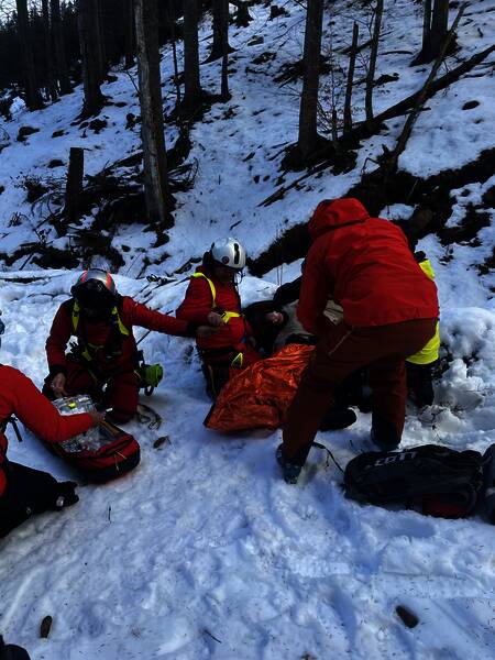 Noch vor dem Eintreffen der Bergretter bei der Unfallstelle, erreichte der Rettungshubschrauber das Opfer und konnte es mittels Tau aus dem schwierigem Gelände retten und anschließend ins Krankenhaus transportieren.